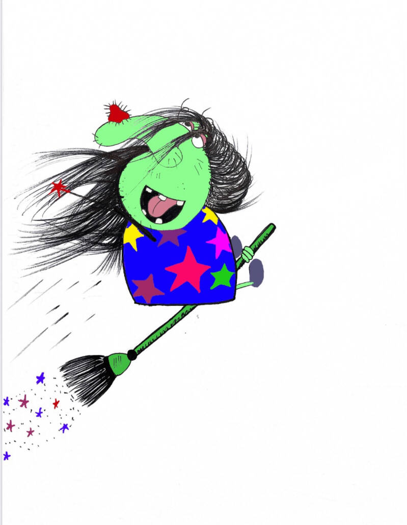 ✨ “Iris zipped through the skyon her old, creaky broom,her wig flapping like a wild flag behind her.