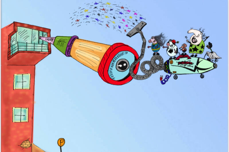the gang hopped onto Iris’s flying vacuum — ready to take a break and splash in the sea. 🧹🌊☀️